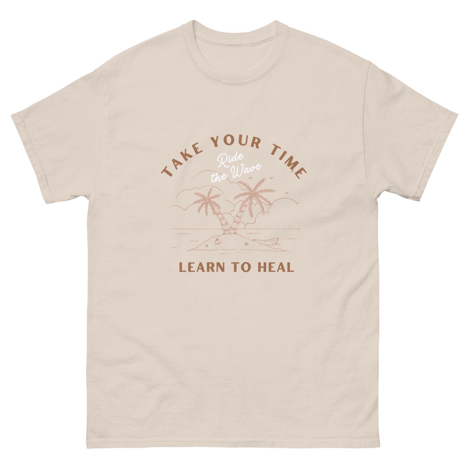 Take your time, ride the wave, and learn to heal. Sometimes that's all we can do when life comes at us. And we love this vintage-inspired, beachy tee and the message it represents.